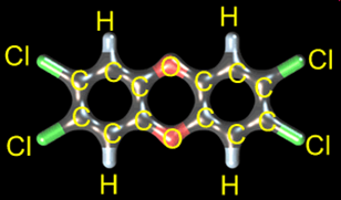 DIOXIN substance, chemical formula is 2,3,7,8 tetra-chloro-dibenzo-para-dioxin – referred to as 2,3,7,8 TCDD. for short