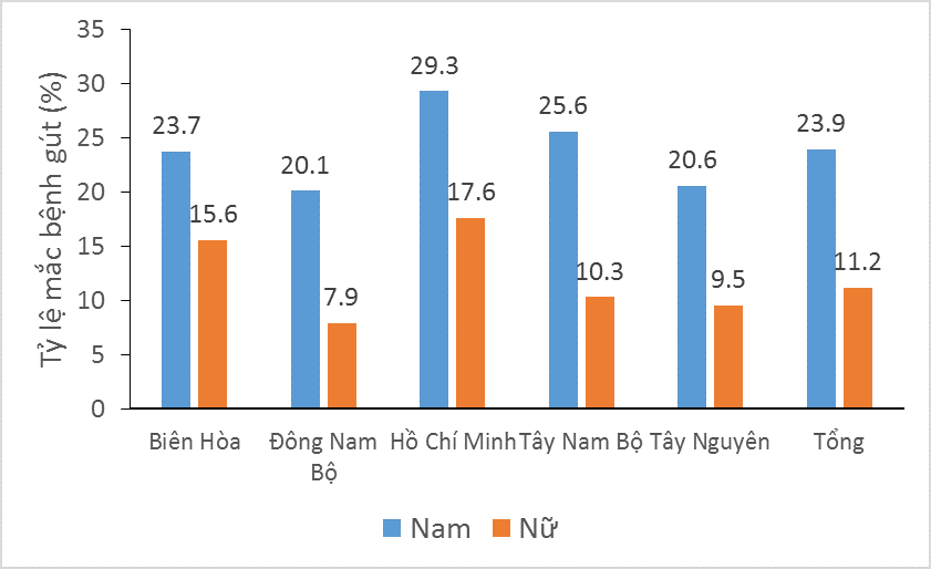 + Gout in both male and female groups is 402/2079 = 19.3%, higher than other countries (the rate in the world is 1 - 10%)