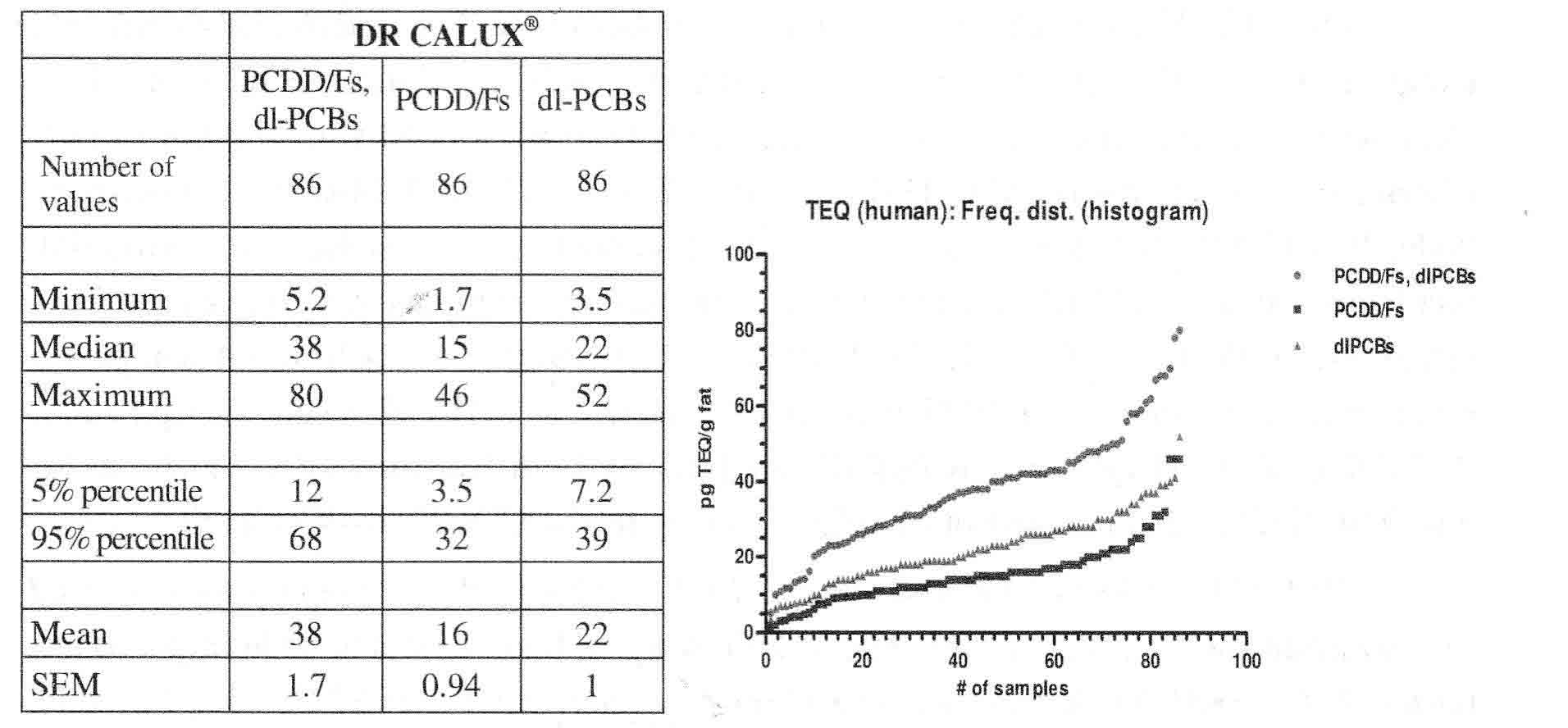 The results of the first case (Germany 2017) in human blood plasma samples from 86 neighbours living near an industrial landfill in the city of Kamp-Lintfort monitored for dioxins and other dioxin-like compounds by DR CALUX® are presented in table 1 and figure 1. Figure 1 shows all our 86 DR CALUX results lined up with increasing concentrations. Here 95% of all DR CALUX® results (95% percentile level; “end of the vertical hockey stick”) are below 68 pg TEQ/g fat. Such biomonitoring equivalents (BE) for dioxins and dioxin-like compounds are reported from different agencies in the same range between 15-74 pg TEQ/g lipid. The 5% percentile level of our study here of 12 pg TEQ/g fat is also in the same range as an earlier proposed ATSDR minimal risk level (MRL) for dioxins of 15 pg TEQ/g lipid [5]. Here it is suggested to use such BE values for evaluation of biomonitoring data for dioxins in the context of existing risk assessments and for prioritization of the potential need for additional risk assessment efforts for dioxins5.