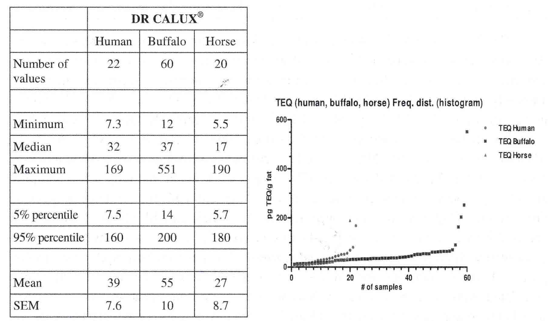 Minimum, median, maximum, mean, 95% and 5% percentile value of the PCDD/PCDF/dl-PCB/dl-compounds-TEQ analysed by DR CALUX® from human, buffalo and horse plasma samples in several locations in the Campania region, Italy (e.g. Avellino, Salerno, Caserta and Napoli area).