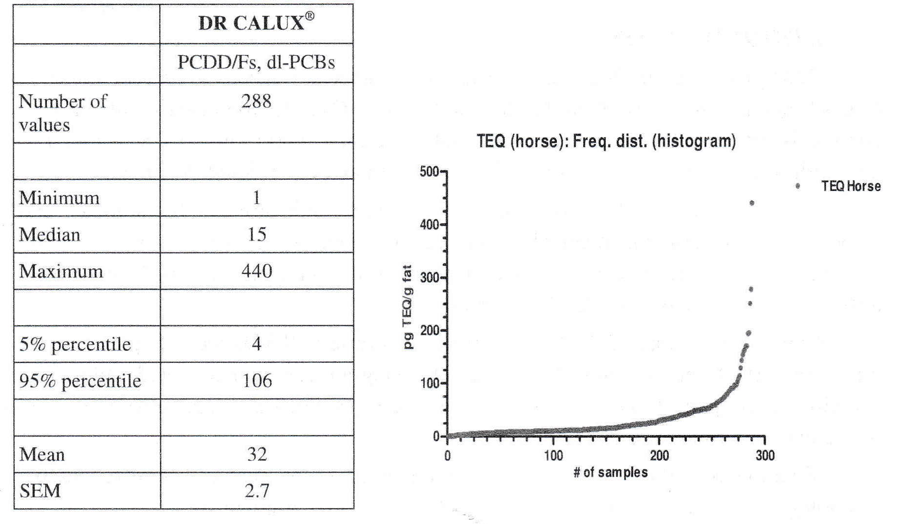 The 3rd case (USA, 2016) involved horse plasma samples collected across the USA: Persistent organic pollutants are associated with metabolic syndrome and other endocrine abnormalities in humans, In horses, such abnormalities in insulin regulation, increased adiposity and laminitis can lead to Equine Metabolic Syndrome (EMS). Therefore, in our study here Ah (TEQ; by DR CALUX®) and estrogenic (EEQ, by ER CALUX®) receptors analysis were used as biomarker-of-exposure in plasma of 288 horses from 33 farms (phenotyped for EMS) (see table 4 and figure 3). The with increasing analysis results in figure 3 presented DR CALUX® results show again that only a few samples are clearly above normal population levels (“vertical end of the hockey stick”). Furthermore, TEQ concentrations were negatively associated with plasma fat extracted and positively associated with the Welsh pony breed. EEQ concentrations were positively associated with pregnancy status and being sampled in summer. Serum glucose, insulin post oral sugar challenge, insulin and non-esterified fatty acid concentrations were associated with EEQ concentration. Serum triglyceride concentration was associated with TEQ concentration. For more info, please let US refer to the already submitted paper [6],
