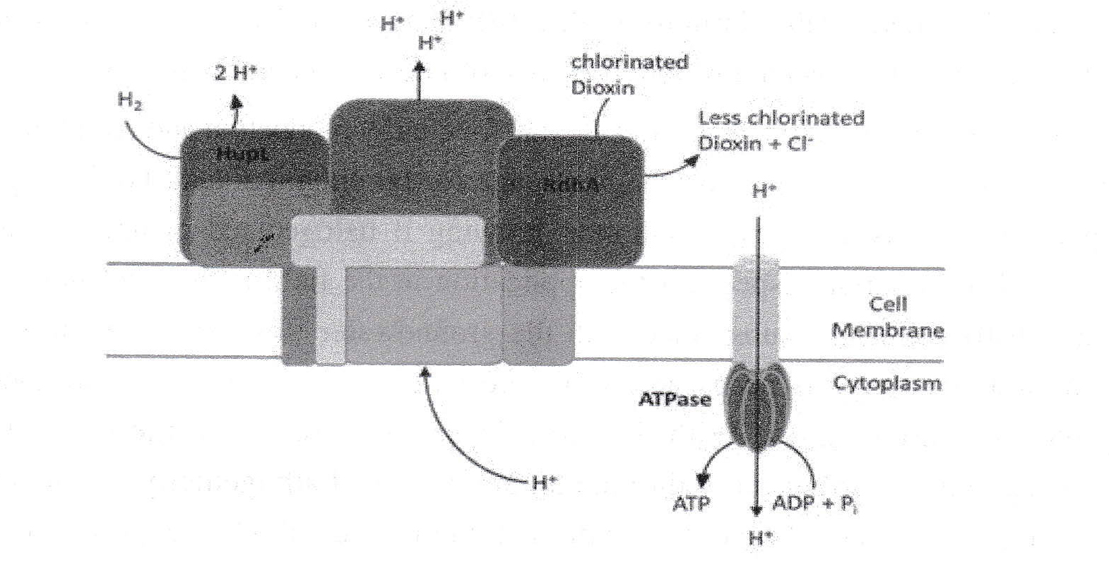 | Box 1: Biochemical background Microorganisms need sources of carbon, nitrogen, phosphor etc., but most of the substrates (~90%) are used for energy production. Respiring organisms need an electron donor and an electron acceptor for energy conservation. Anaerobic bacteria in soil or groundwater use small molecules as electron donor and an electron acceptor other than oxygen. Dehalococcoides species use chlorinated dioxins as an electron acceptor in an anaerobic respiration. By this respiration (Fig. 2) a proton gradient is generated across the cell membrane which is used for ATP regeneration by an ATPase. We are investigating the biochemical background in detail in our laboratory (Kublik et al, 2016; Seidel et al, 2018). Biochemical peculiarities in Dehalococcoides (missing quinones, missing cytochromes, monoderm cell envelope, organization of all electron transferring subunits in one single protein complex) might confer the capacity to catalyze exceptional reduction reactions