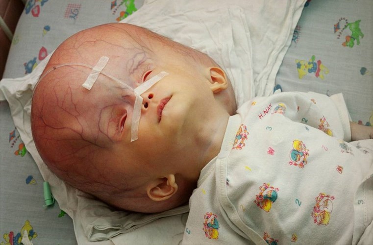 The unusually big head of Minh Hai, a victim of Agent Orange sprayed during Vietnam War,who was raised at Hoa Binh Children's Village, Tu Du Hospital, Ho Chi Minh City in 2000. Photo credit: Chris Steele-Perkin / Magnum Photos