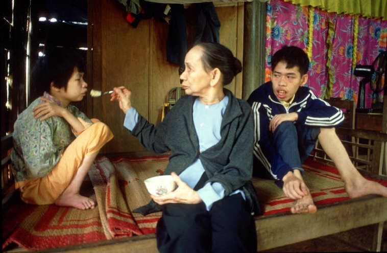 Mrs. Nguyen Thi Huyen feeds her daughter. Behind is her 31-year-old son, who has physical and mental retardation due to the sequelae of Agent Orange. Photo credit: Chris Steele-Perkins/ Magnum Photos