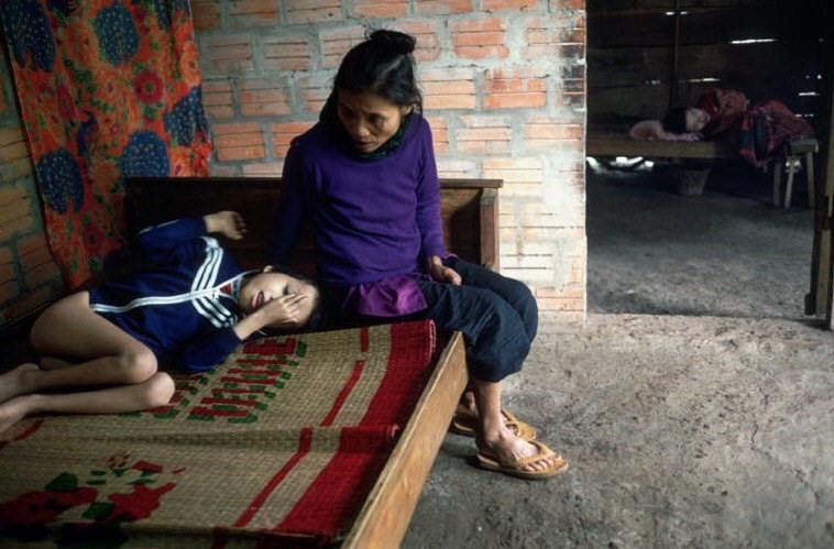 Major General Nguyen Don Tu with his 27-year-old daughter Nguyen Vu Ha Lan, who was disabled due to the sequelae of Agent Orange, in Hanoi in 2000. General Tu was infected with Agent Orange during his service in the Southern battlefield. Tu has a normal daughter older than Lan. Photo credit: Chris Steele-Perkins/ Magnum Photos.