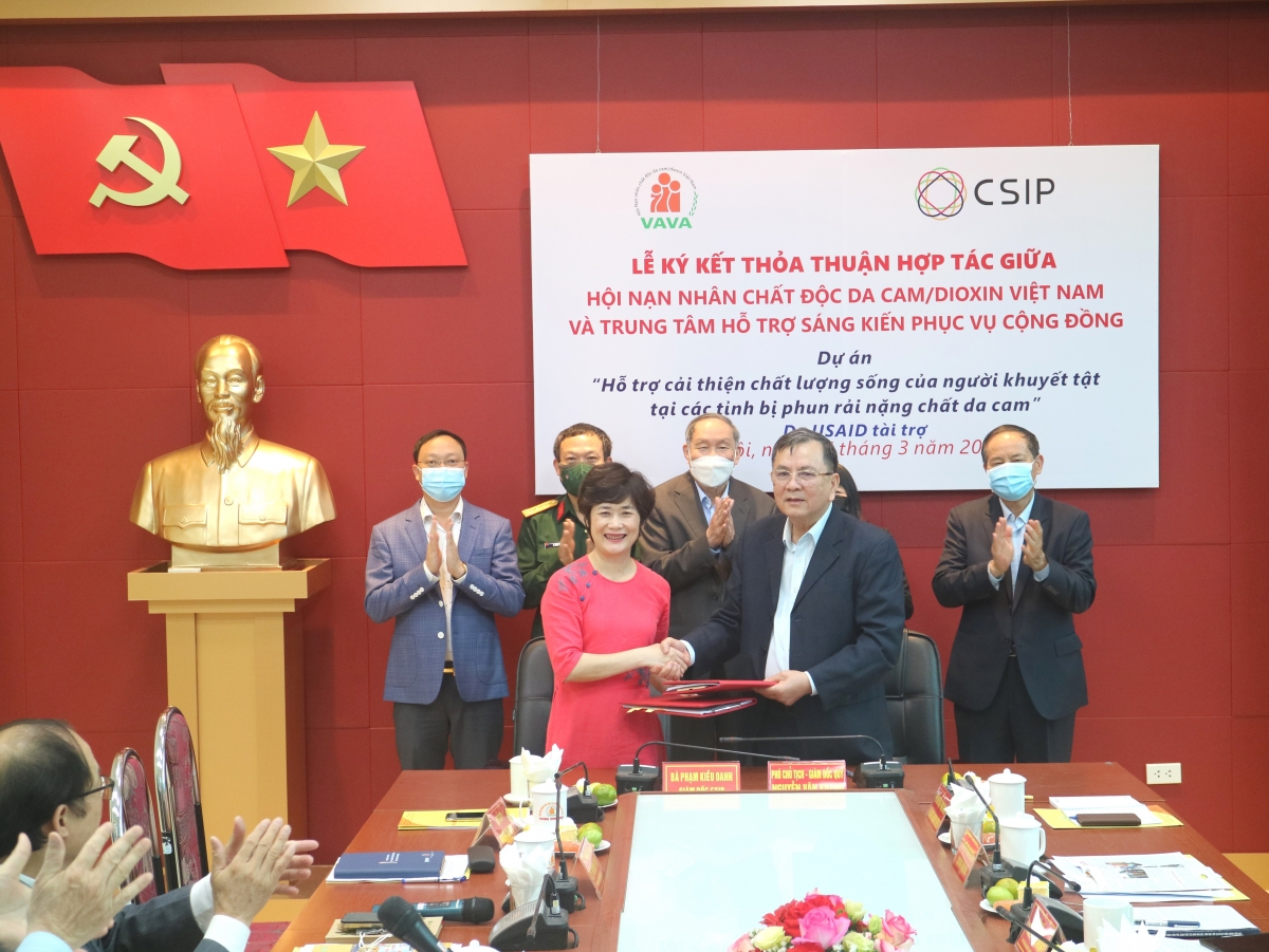 The ceremony saw the attendance of Senior Lieutenant General Nguyen Van Rinh, former member of the Party Central Committee, former Deputy Minister of National Defense, President of VAVA; Lieutenant General, Assoc. Prof. Dr. Dang Nam Dien, Vice President - General Secretary of VAVA; Mr. Nguyen Van Khanh, Vice President - Director of the Vietnam Fund for Victims of Agent Orange/Dioxin; Senior Colonel Le Dinh Vu, Chief of the Office of the Standing Office of the National Steering Committee for overcoming the consequences of bombs and mines and toxic chemicals after the war in Vietnam (also known as Steering Committee 701); Dr. Tran Duc Hung, Deputy General Director of the National Action Centre for Toxic Chemicals and Environmental Treatment (NACCET); Ms. Ann Marie Yastishock, Director of USAID (attending online); Ms. Pham Kieu Oanh, Director of CSIP; offices, departments and units under VAVA; leaders of the 8 provincial associations for victims of Agent Orange/dioxins within the scope of the project, including: Quang Tri, Thua Thien Hue, Quang Nam, Binh Dinh, Kon Tum, Binh Phuoc, Dong Nai and Tay Ninh.